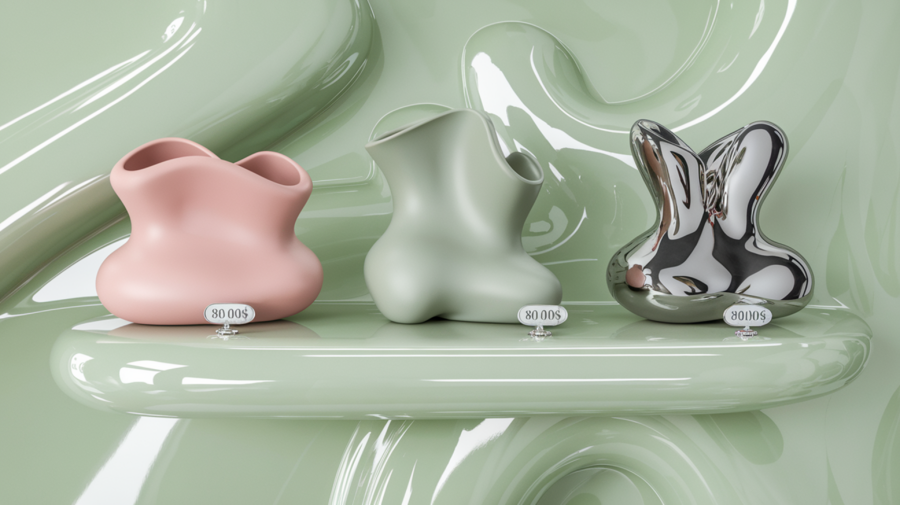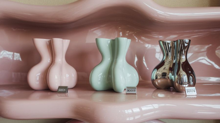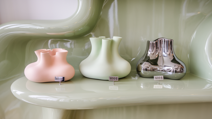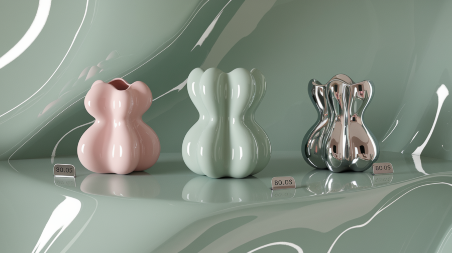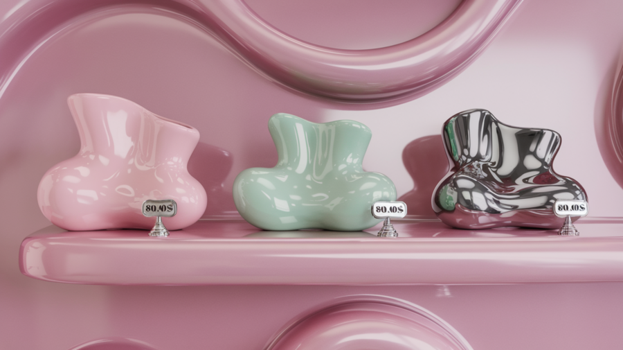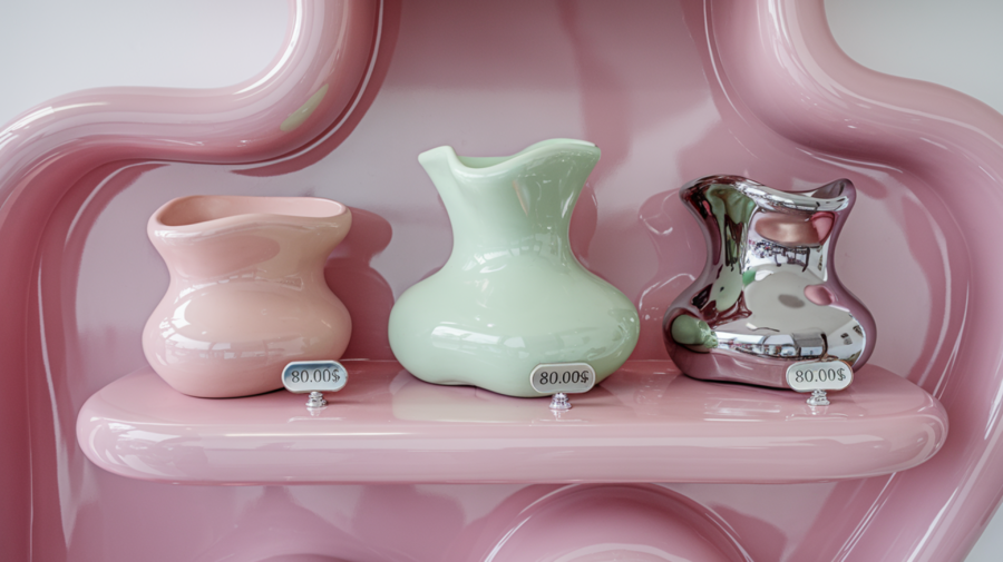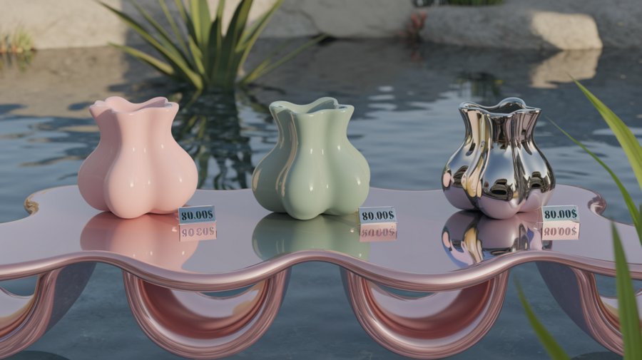 https://ideogram.ai/ Prompt: A product shot of three clay vases on a glossy pink, wavy, curvy shelf. The vases are amorphous, undulating, and wavey curvy. They are in pastel pink, pastel green, and chrome colors. There are small chrome price tags «80.00$» standing on a shelf near each of the vases. The background is undulating pastel pink. The lighting is soft. There are water glares.