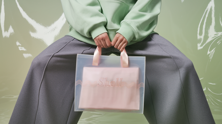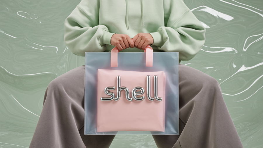 https://ideogram.ai/ Prompt: A realistic photograph of a person wearing a huge oversized pastel green hoodie and grey extremely wide trousers. The person is holding a matte transparent plastic bag with chrome undulating wavey curvy flat small text «shell» on it. The bag is made of thick matte plastic and has two pastel pink ribbon handles. There is a pastel pink package inside the bag, and it is blurred a little. The background is a glossy pastel green wavey undulating surface.