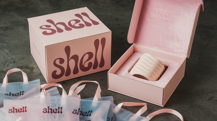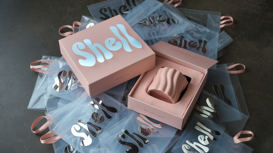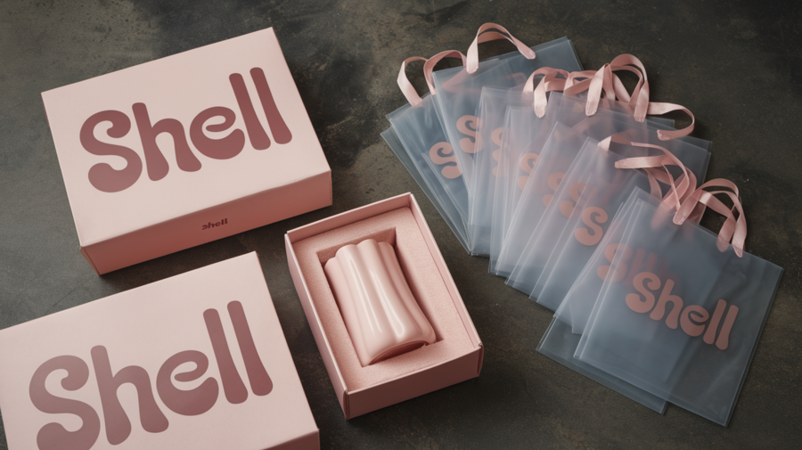 https://ideogram.ai/ Prompt: A realistic photo of a pastel pink package with the large, wavy, curvy text «shell» printed on it. There is a second box, opened, revealing pastel pink velour lining and a wavy, curvy mug inside. The two boxes are the same size and are lying on a scattering of transparent plastic bags with the chrome, wavy, curvy text «shell». Each bag has two pastel pink ribbon handles. The setting is on a dark grey concrete floor.