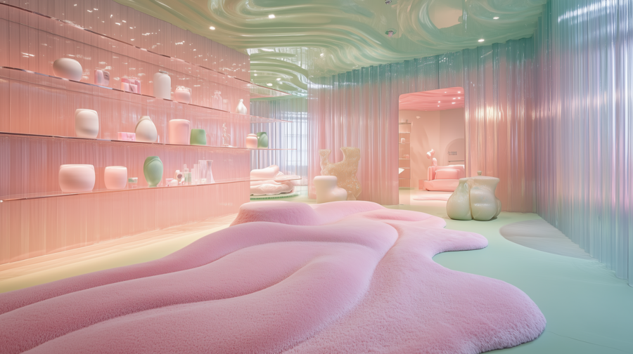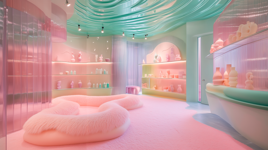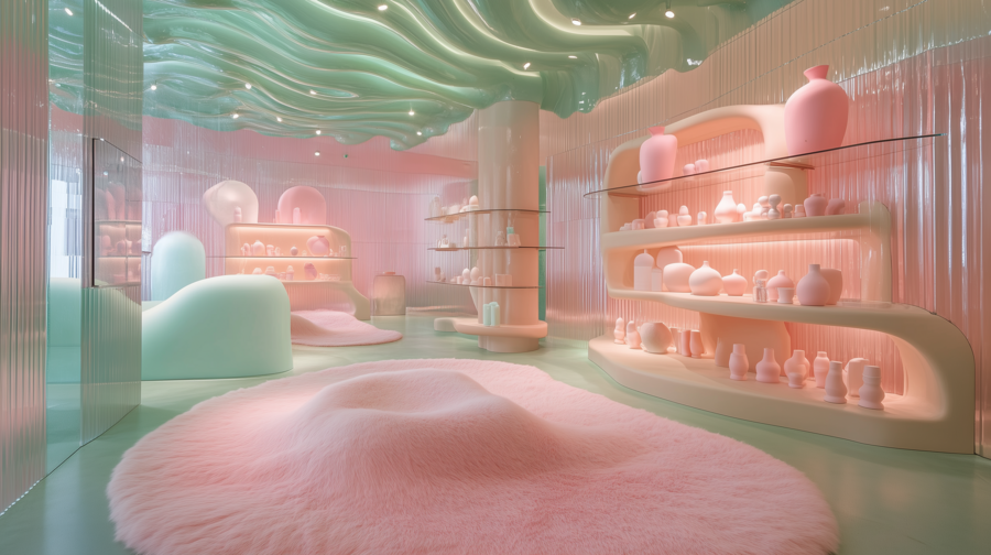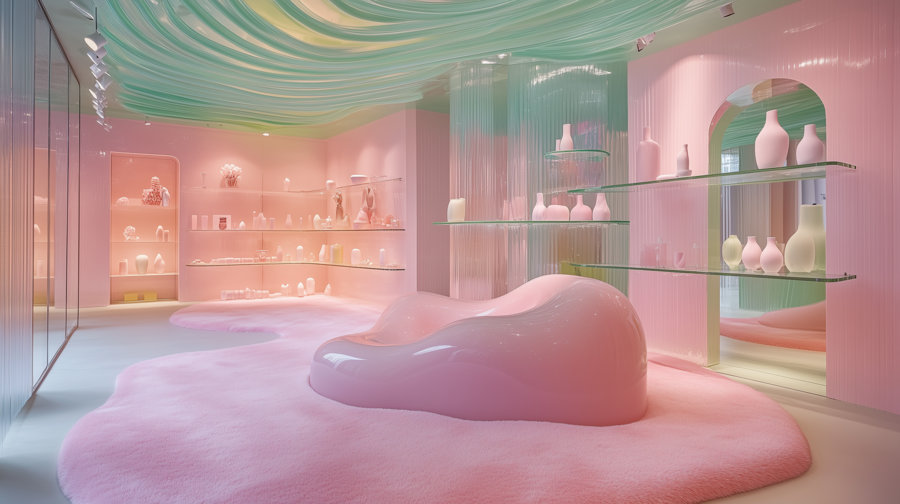 https://www.midjourney.com/ Prompt: A room made of glass and tiles, with pastel colors. A fluffy pink wavy carpet in the center of the room, on it there is a shelf for goods in the shape of a large stone with rounded corners. Amorphous chrome vases are placed on the shelf. Pink and silver chrome plated. There are shelves on the walls of the room, on which the same wavy vases are placed. Ceiling painted in light green and pink hues with shiny, liquid-like waves. Hyper-realistic photography, an editorial photoshoot. Pastel pink and green colors, chrome effect, glass. --ar 16:9