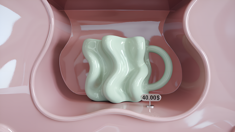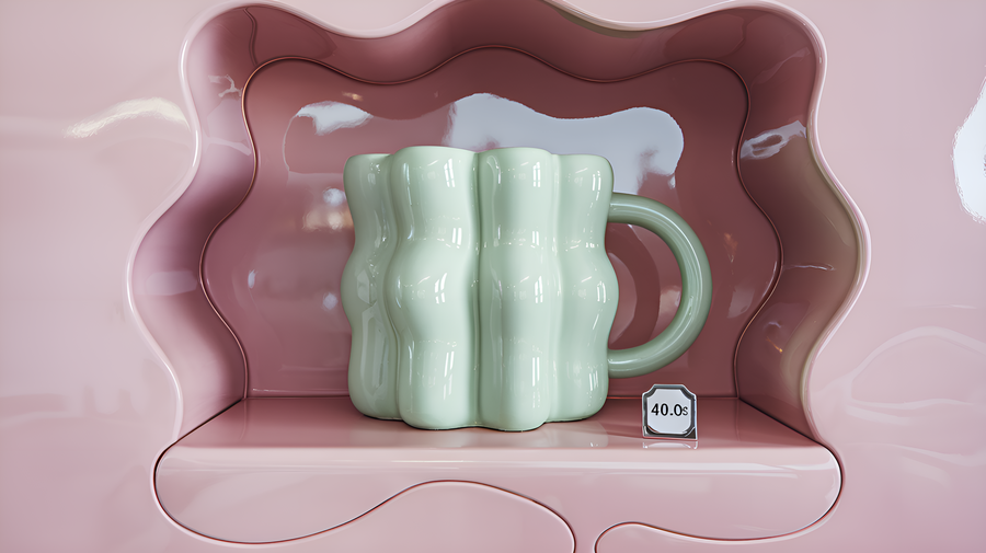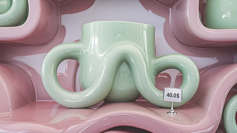 https://ideogram.ai/ Prompt: A realistic photograph of a large, amorphous, undulating, wavy curvy clay mug with a pastel green color. The mug is placed on a glossy pink wavy curvy shelf. There is a small chrome price tag «40.00$» standing on a stand near the mug. The background is clean and minimalistic.
