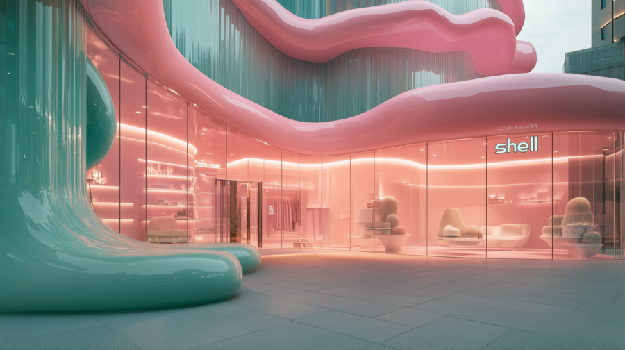 https://www.midjourney.com/ Prompt: https://s.mj.run/VYsbf7mObB4 Glossy pastel pink building on New York street. Building has undulating, amorphous, wavy shape, glossy, glass. Building has luminous signboard undulating amorphous wavy «shell». Building has chrome and pastel green details. Extra realistic photography. --ar 16:9
