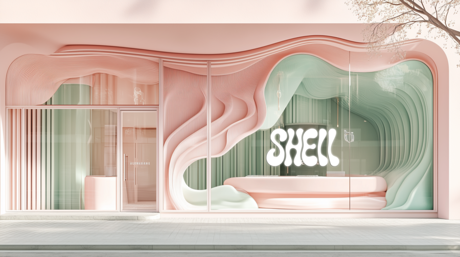 https://www.midjourney.com/ Prompt: A high-quality storefront sign mockup, featuring fantasy, curvy, undulating, pearl designs. Facade of the store is undulating and wavy. There is a big window. Pastel pink and green hues. --ar 16:9