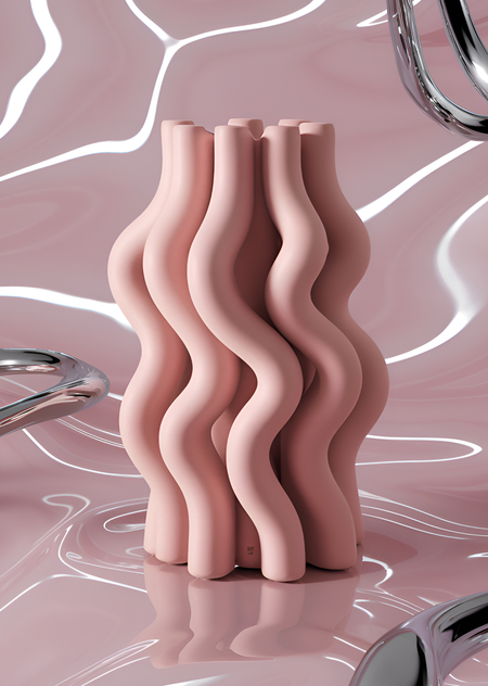 https://ideogram.ai/ Prompt: A photo of a clay vase with an amorphous, undulating shape, resembling corals and waves. The vase is pastel pink and is placed on a glossy pink, wavy curvy background. There are amorphous undulating chrome shapes flying in the air. The photo has a product shooting style. There are glares from water.