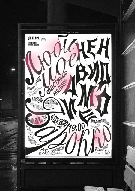 Плакат создан для выступления музыкантов-экспериментаторов в рамках фестиваля «нА ПИКе FEST». Он стилистически отражает название концерта «Любимое ненавидимое барокко», так как использована пластическая типографика и розовые блики в качестве акцентов.