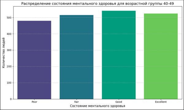 На графике мы наблюдаем нижнюю точку в возрастной категории 20-29 лет и пик в категории 40-49 лет. Я решила проанализировать распределение количества людей с различным состоянием ментального здоровья в этих возрастных группах.