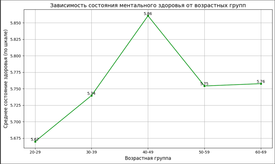 Мне стало интересно, зависит ли ментальное здоровье от возрастных групп. В файле в столбце 'Mental_Health_Status' представлены значения 'Good', 'Fair', 'Excellent' и 'Poor', которым я присвоила числовые значения 7, 6, 9 и 1 соответственно. На основе этих данных я построила график.