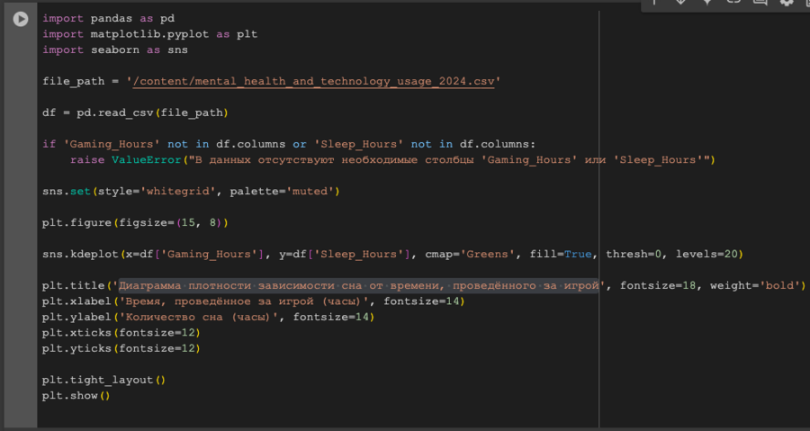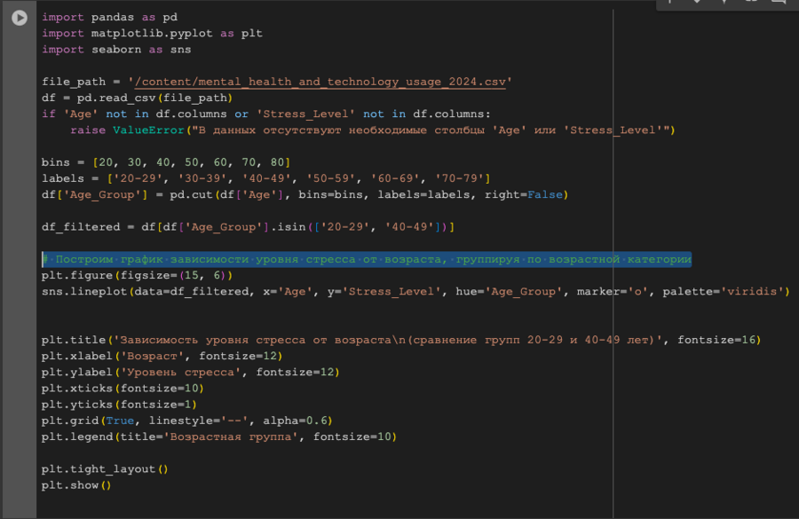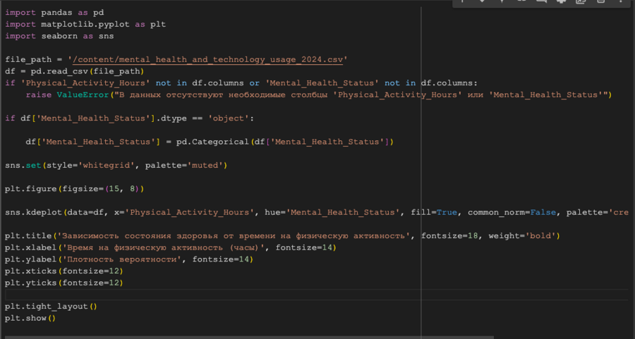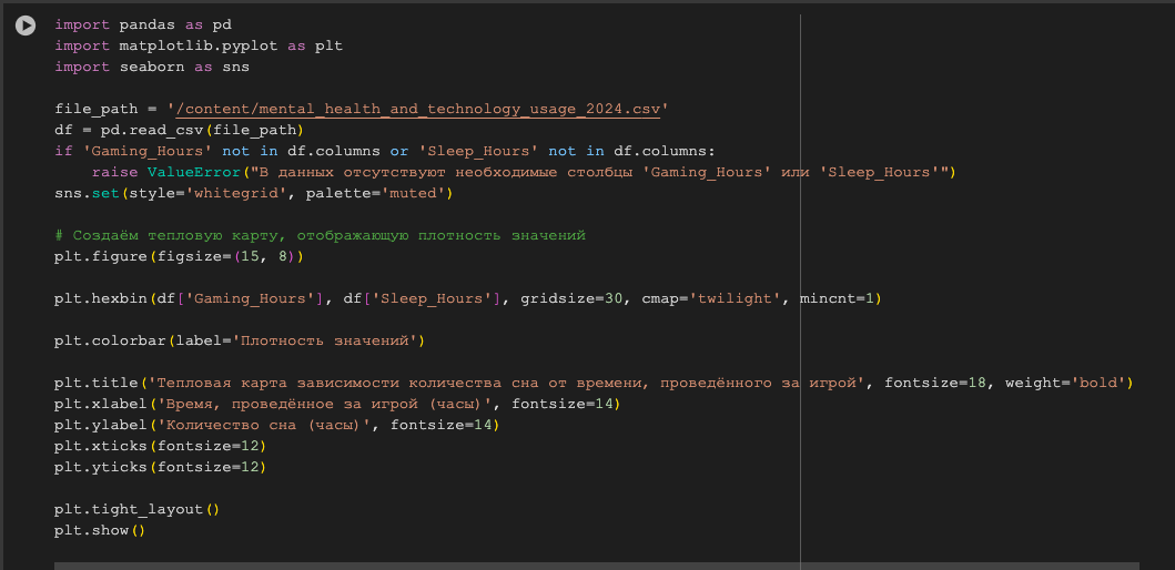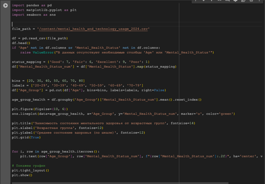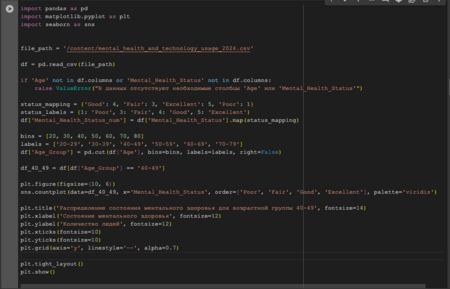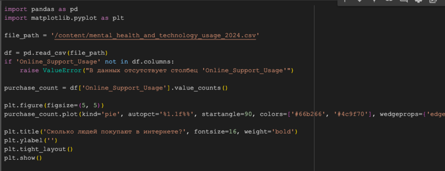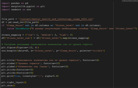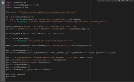 На платформе Kaggle я обнаружила датасет «mental_health_and_technology_usage_2024», который вызвал у меня живой интерес к его анализу и визуализации. В этом увлекательном процессе мне помог язык программирования Python, а также среда Google Colab, в которой я работала. Верным помощником и источником вдохновения стал чат-бот GPT, предоставляющий ценные подсказки и рекомендации.