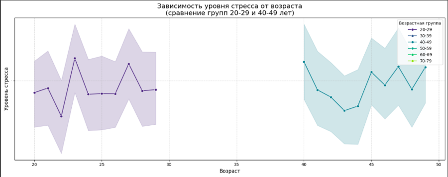 Затем мне стало интересно, зависит ли состояние ментального здоровья от уровня стресса. Я решила сравнить уровень стресса для этих двух возрастных категорий.
