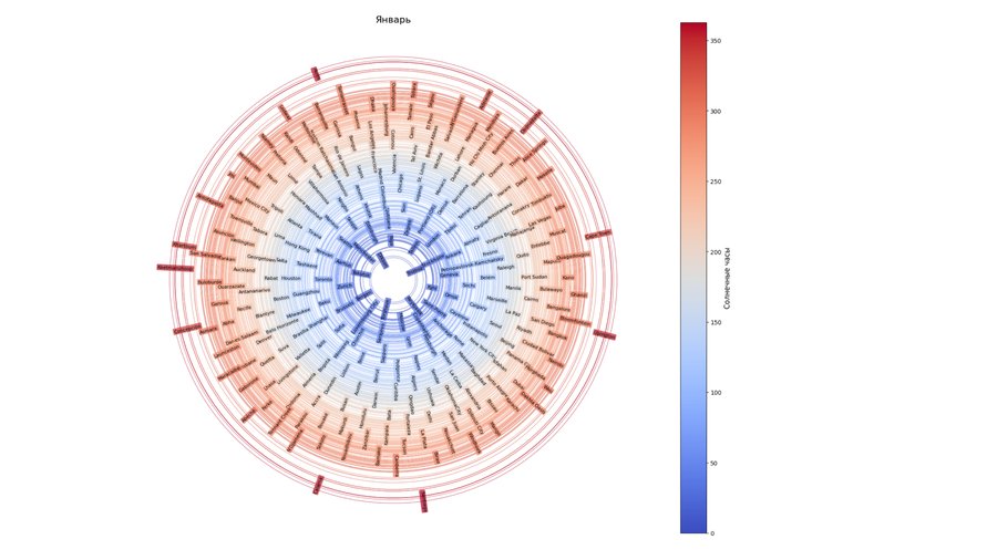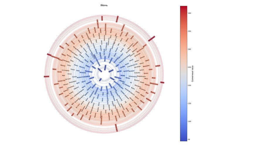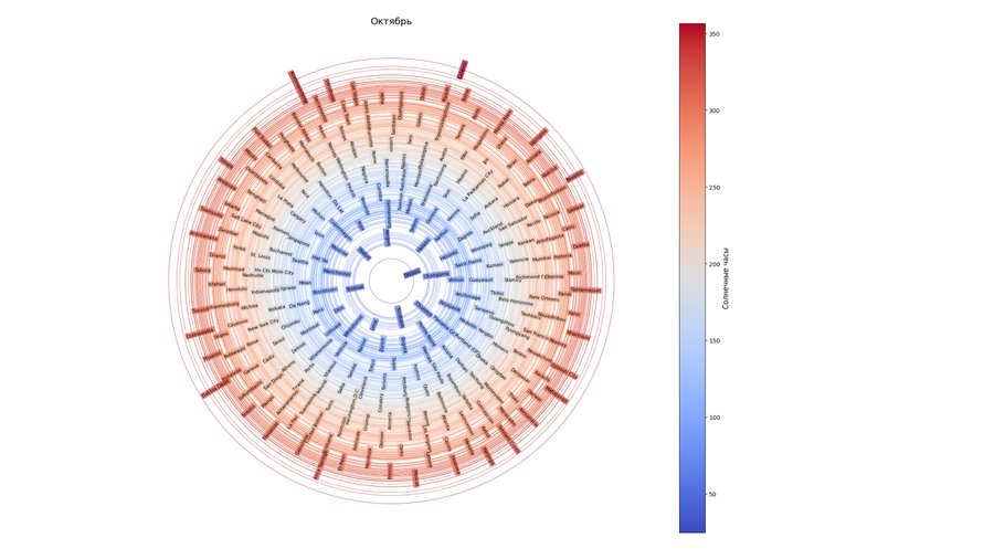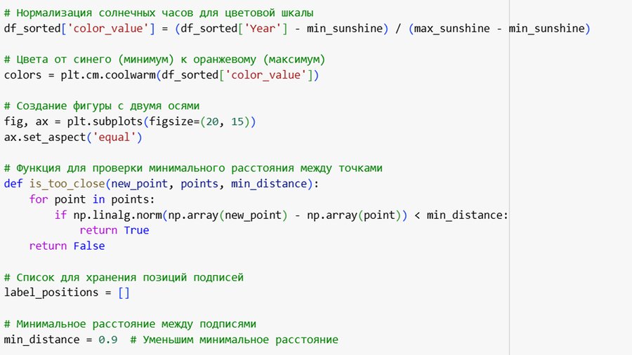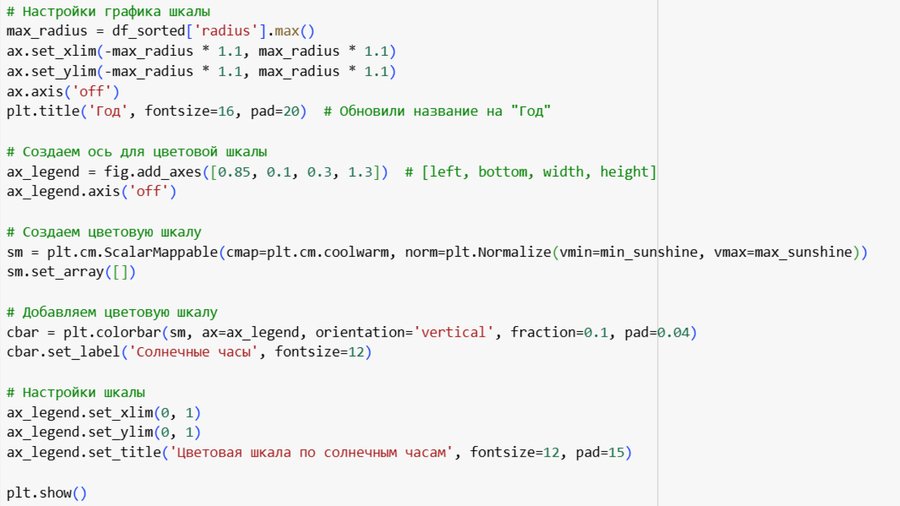 В проекте библиотека matplotlib создаёт цветовую шкалу, которая отображающет диапазон значений от минимального до максимального количества солнечных часов. Для этого использована палитра coolwarm, создающая градиент от синего (минимум) к оранжевому (максимум).