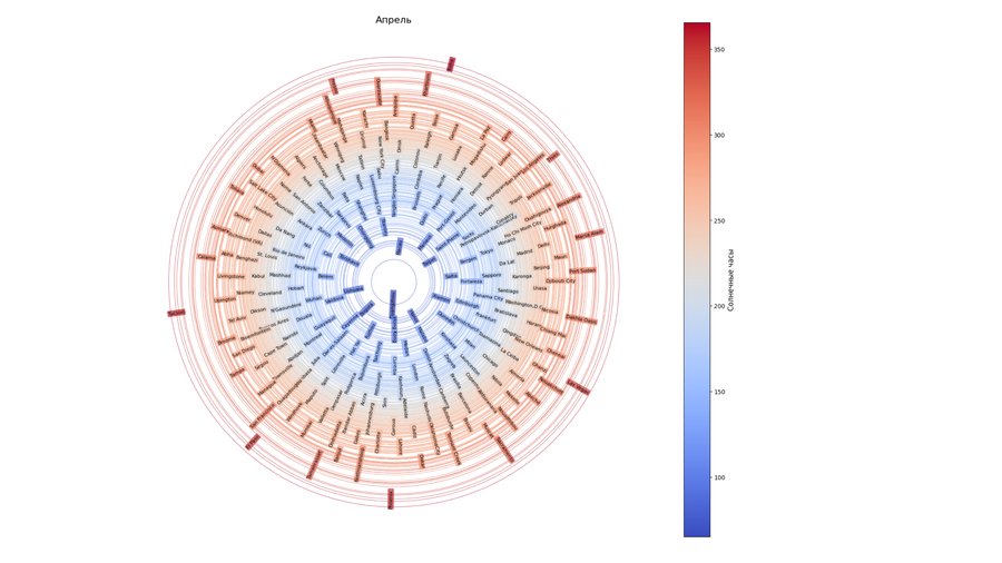 Радиусы кругов рассчитываются на основе количества солнечных часов, а цвета подбираются в соответствии с нормализованными значениями.