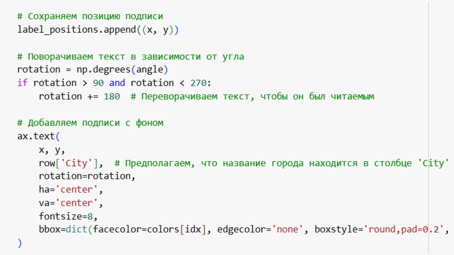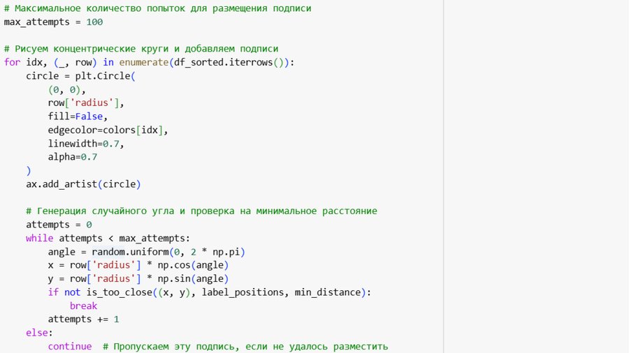 С помощью генерации случайных координат и проверки на минимальное расстояние улучшается читаемость текста. Подписи также дополнены фоном, который соответствует цвету круга, что делает визуализацию более гармоничной.