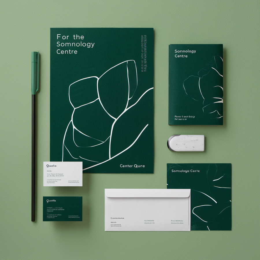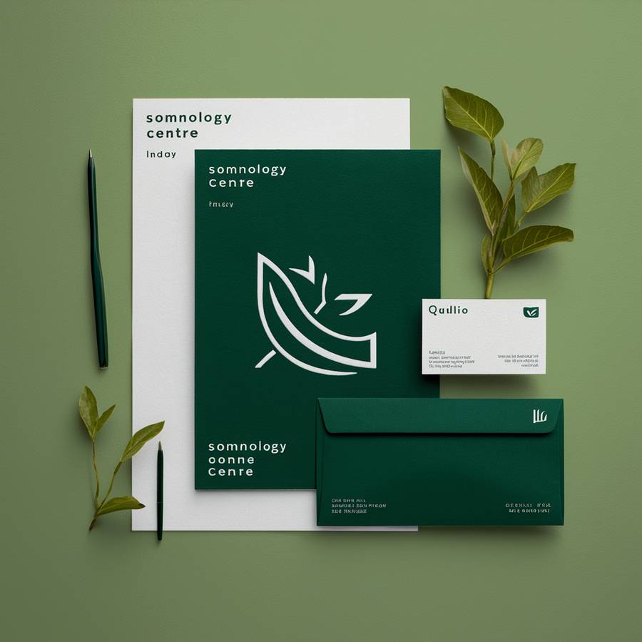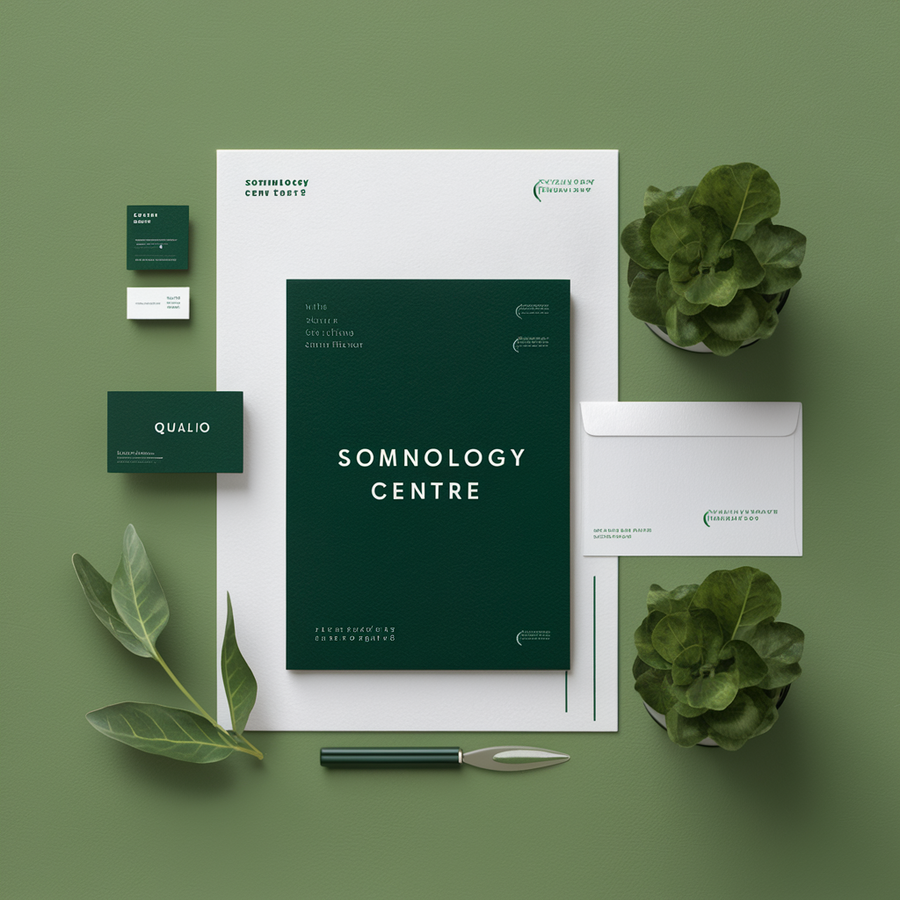 ideogram: generate a mockup of printed materials (paper, envelope, business cards) on a a very light green background for the somnology centre QUALIO in deep dark green and white colors