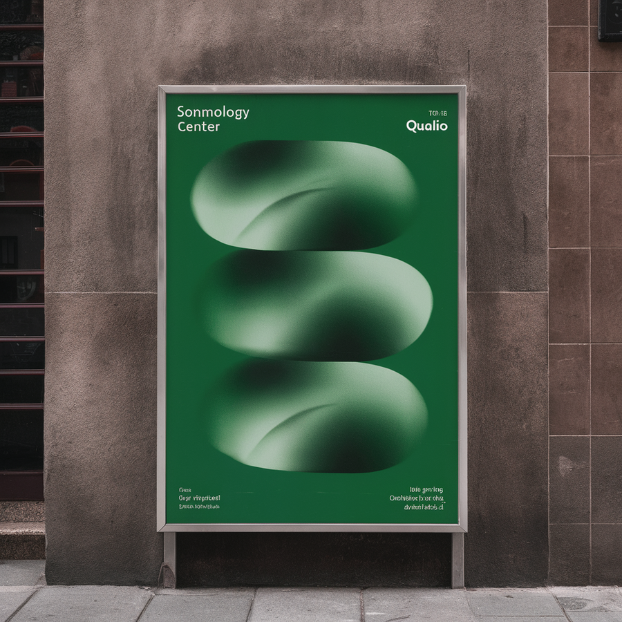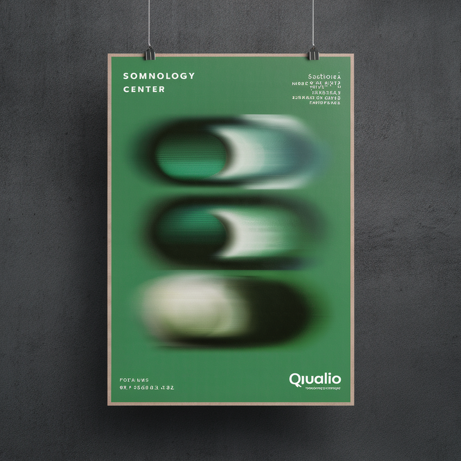 ideogram: a poster for somnology center QUALIO depicts green coloured 3 blured abstract shapes and microtypography on it in