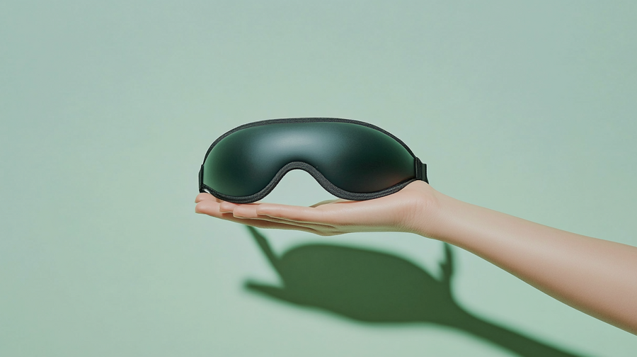 midjourney: a monolithic device of super minimalistic Jonathan Ive design without seams, it is a sleeping mask of deep green colour floating in the air in front of monochromatic very very light green warm background, hyperrealistic product photography, studio light, three-quater view, ultrarealistic, highly detalised — ar 16:9 — style raw — q1
