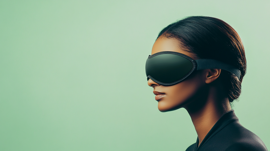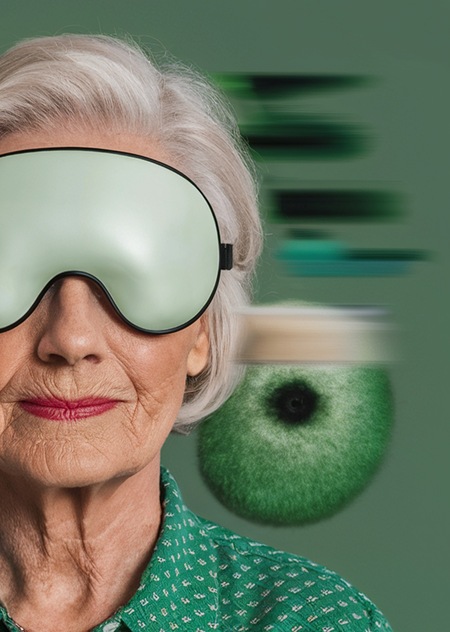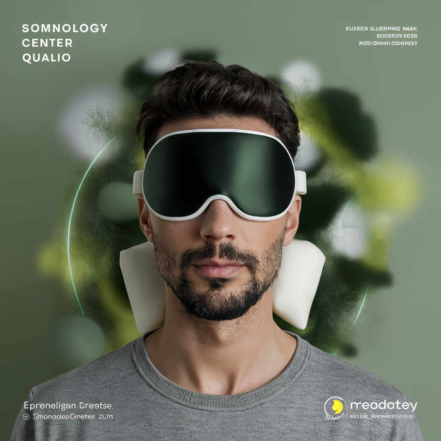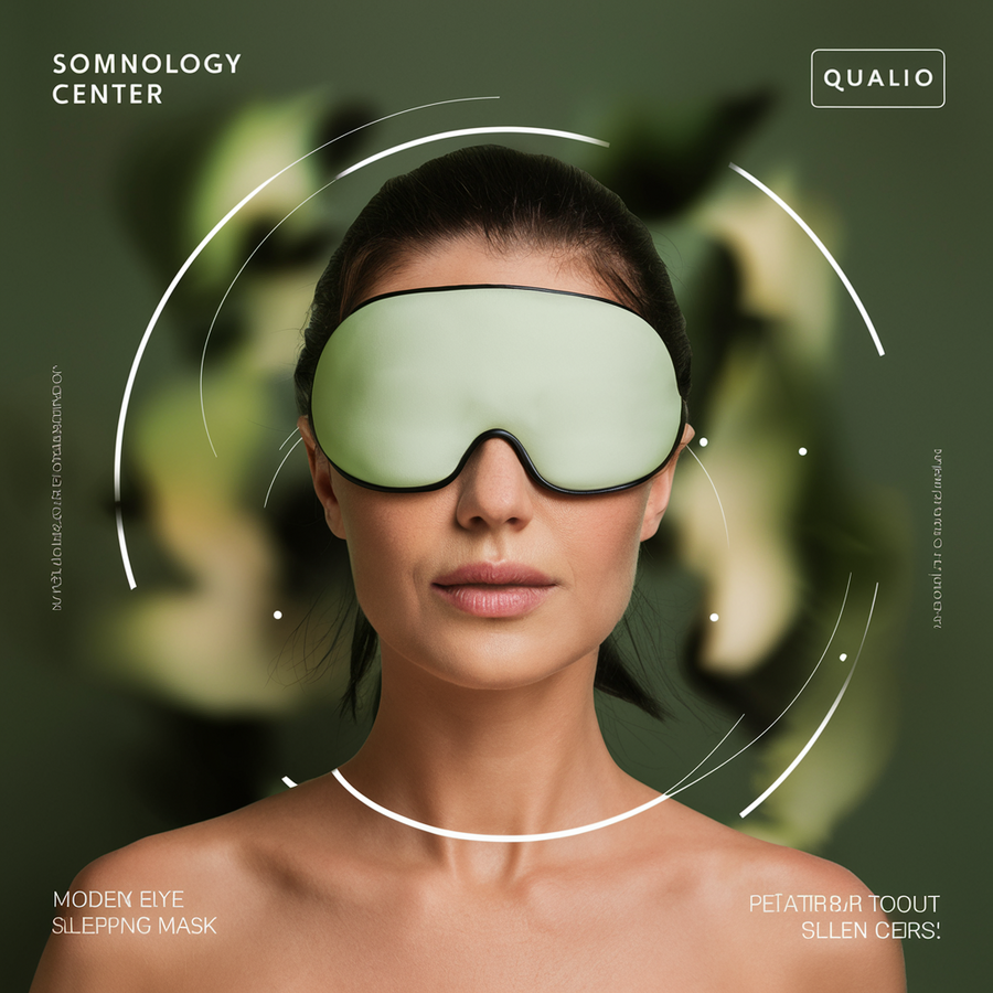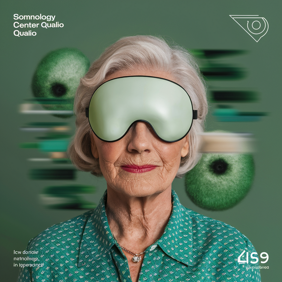 ideogram: creative advertising poster for somnology center QUALIO, featuring a modern eye sleeping mask on an woman/man/old lady, surrounded by blured abstracts in green colours