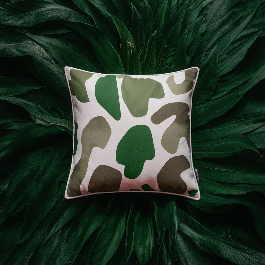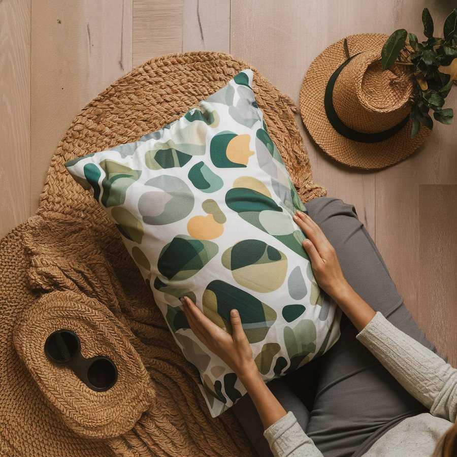 ideogram: a pillow covered with pattern of warm green blured abstract forms from top view
