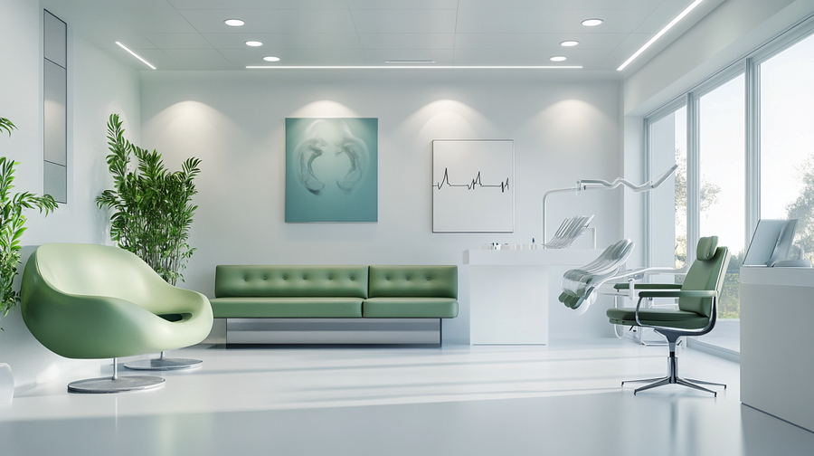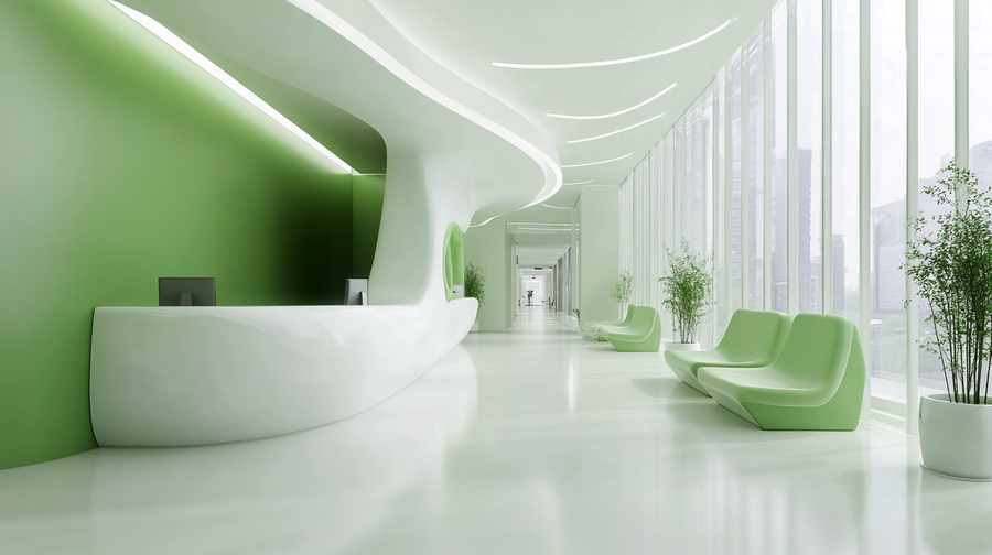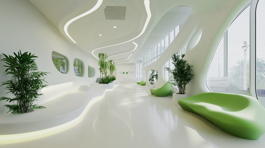 2. /2.1. a modern white biomorphic interior of medical center with warm light green colored elements --ar 16:9 --q1 --style raw