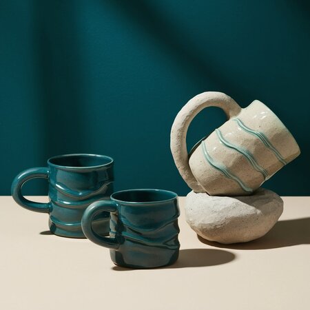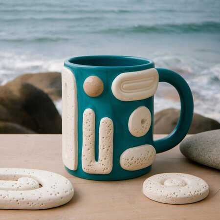a design for mugs with a relief surface, inspired by nature/stone/sea motifs in the spirit of the sculptures of artist Barbara Hepworth. marine colors: dark turquoise, beige or white. the background is natural, imitation of a seaside area