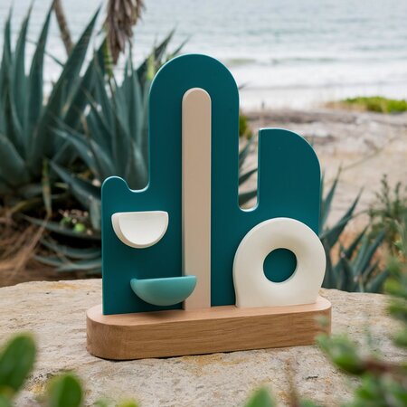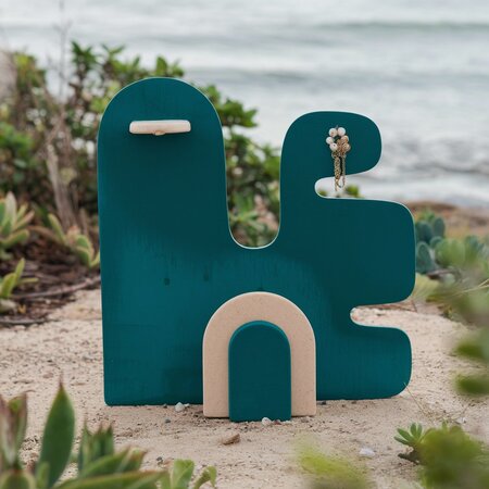images of jewelry organizers with nature/sea motifs in a nautical color scheme: turquoise, beige or white. the shape can be abstract and inspired by the sculptures of artist Barbara Hepworth. the background is natural, seashore, plants