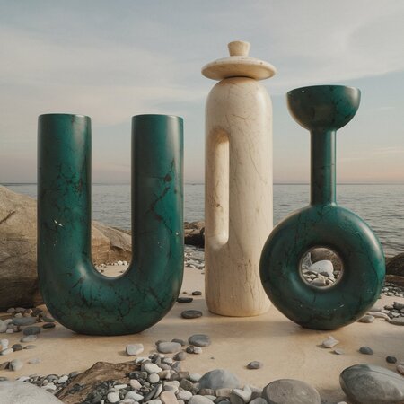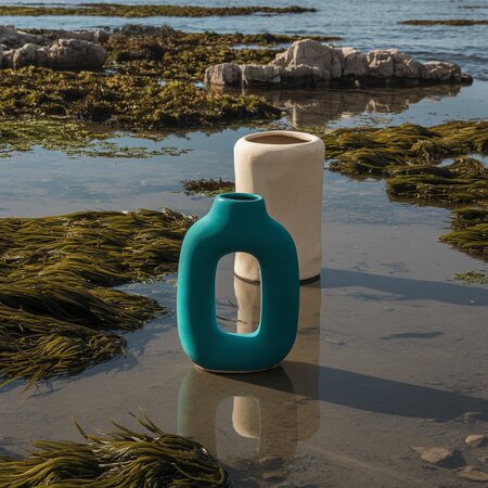 a design for minimalist vases inspired by nature/stone/sea motifs in the spirit of the sculptures of artist Barbara Hepworth. marine colors: dark turquoise, beige or white. the background is natural, imitation of a seaside area