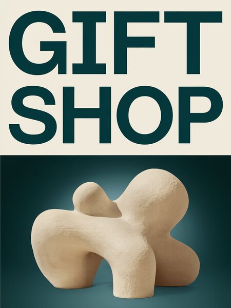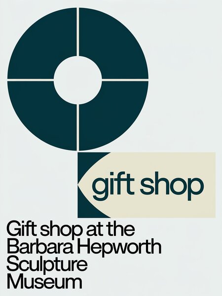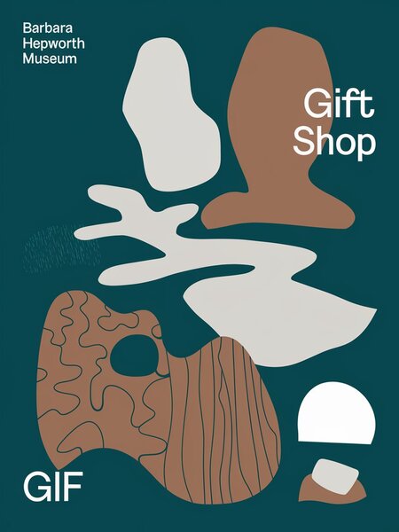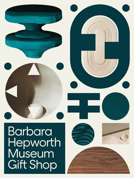 generate a modern minimalist poster for a gift shop in the Barbara Hepworth sculpture museum. the poster should not be overloaded with elements and text, abstract forms inspired by Barbara Hepworth’s sculptures, sea/stone/wood motifs are possible. the main colors are dark turquoise, white and beige