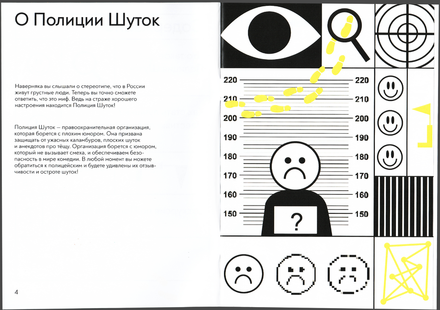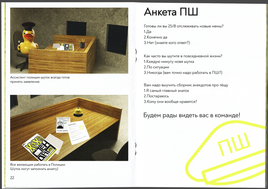 Брошюра о Полиции Шуток. В ней можно узнать об устройстве ПШ, работниках полиции и отделении. Брошюра ориентирована на тех, кто хочет присоединиться к команде Полиции Шуток.