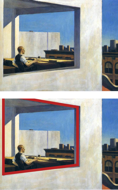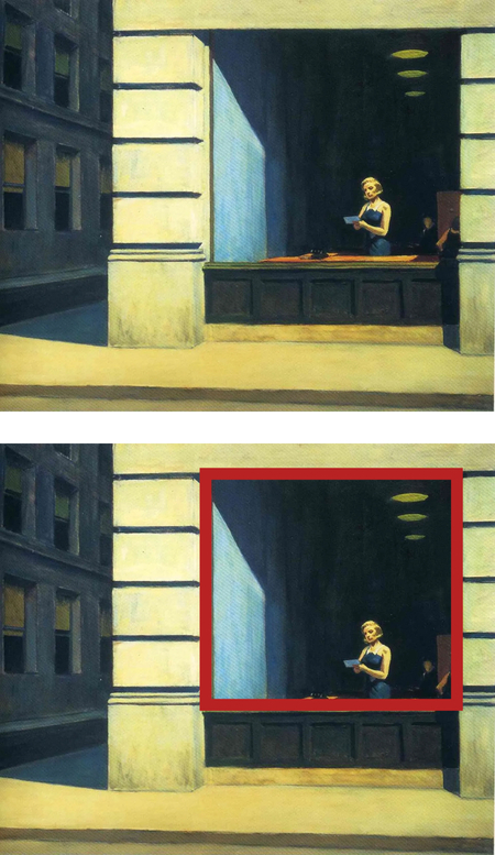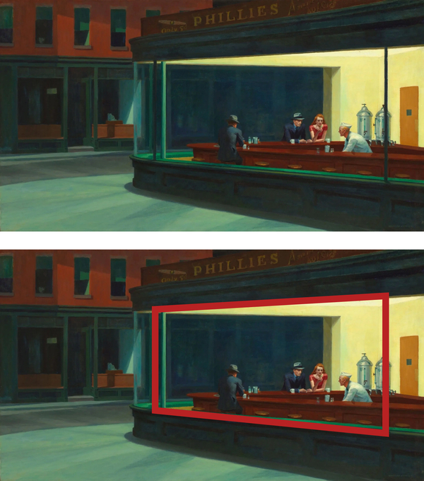 Продолжая исследование композиционных приёмов Эдварда Хоппера, важно подчеркнуть, что ощущение замкнутости и отчуждённости его персонажей передаётся не столько через мимику или жесты, сколько через работу художника с пространством. Хоппер создаёт особую визуальную среду, где каждый герой словно заключён в невидимую «рамку». Часто в его картинах встречаются окна, витрины, проёмы — элементы, которые внешне должны символизировать открытость и прозрачность, но на деле становятся барьерами, подчеркивающими отчуждение. Эти преграды изолируют персонажа от внешнего мира. Зритель остаётся по одну сторону «рамки» — снаружи, а герой заключён по другую — внутри. Таким образом, усиливается дистанция между персонажем и реальностью.