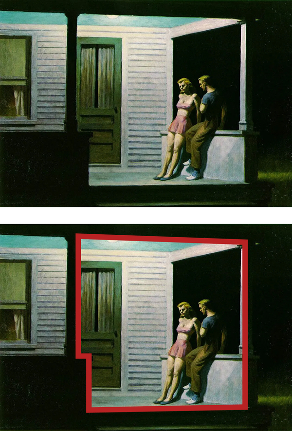 Таким образом, композиционные границы у Хоппера выполняют не только декоративную или пространственную функцию, но становятся важнейшим выразительным средством. Через них художник передаёт внутреннее состояние персонажей — одиночество, отчуждение, невозможность сближения. Эти «рамки» — символические границы между человеком и миром, между внешним и внутренним, между «я» и «другим».