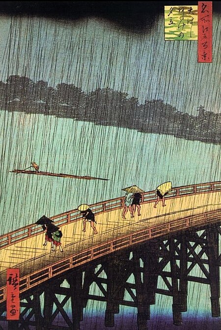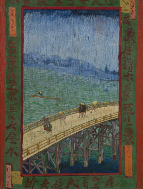 Также Ван Гог копировал некоторые работы японских мастеров. Одной из самых известных копий является картина «Япония, Мост под дождем», вдохновлённая Утагавой Хиросиге и его эстампом «Внезапный летний ливень». Ван Гог почти точь-в-точь повторил картину Хиросиге. Он сохранил композицию, однако оригинальные цвета немного изменены. Ван Гог делает их сочнее, ярче, выделяя лес и грозовое небо оттенками синего. Так он усиливает впечатления от контрастов тёмного фона и яркого моста на переднем плане. Вода занимает большую часть пространства на картине. Её Ван Гог пишет маленькими, короткими мазками, чередуя зелёный и синий цвета. Также картина окаймлена зелёной рамкой с красными фрагментами. Этот элемент несёт в себе исключительно декоративную функцию, а иероглифы, нанесённые по периметру картины, ничего не значат.
