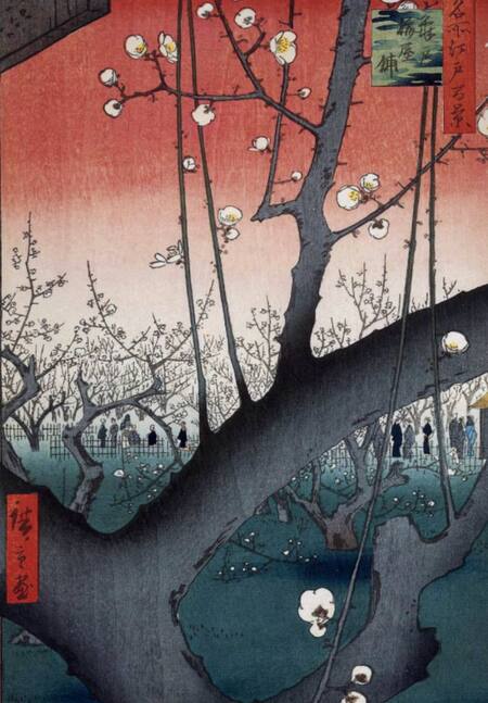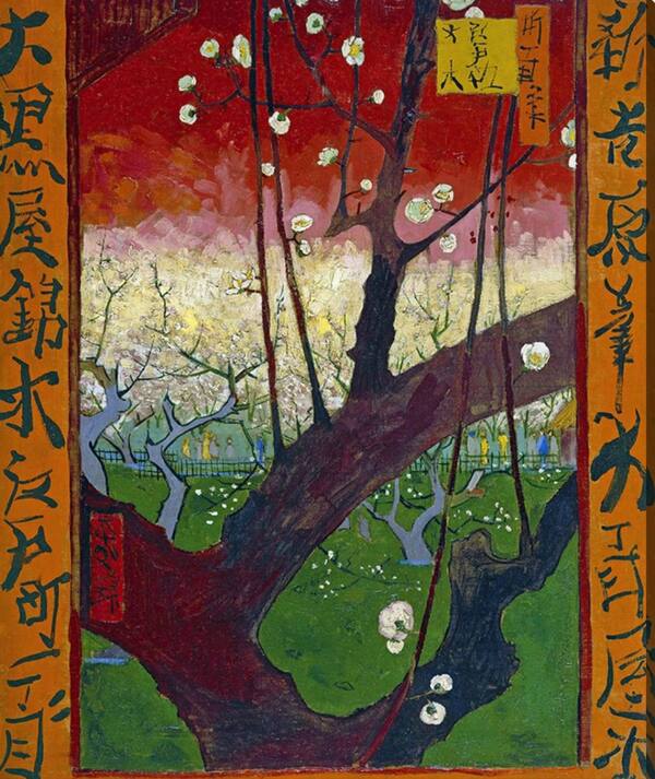 Ещё одной копией японского мастера является картина «Цветущий сливовый сад», оригинал которой также был создан Хиросиге. В этой картине Ван Гог уже более смело отходит от европейского стиля, перенимая японский. Мазков становится гораздо меньше, они чётко видны только на дереве на переднем плане и в кронах слив на заднем плане. Стволы имеют чёткий контур и ровный единый тон внутри. Трава также полностью залита плотным, зелёным цветом. Она контрастирует с ярким красным небом. В этой картине Ван Гог гораздо смелее использует яркие цвета и заполняет ими пространство, пробуя японский метод вставки больших фрагментов чистого цвета.