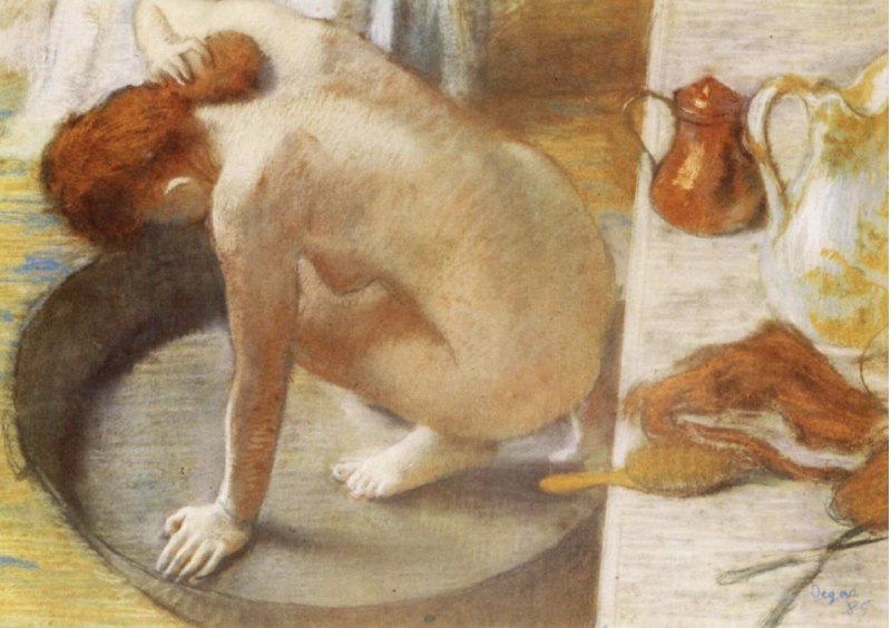 Эдгару Дэга больше импонировала композиция японских гравюр. Ему нравилось, как предметы, люди и животные, даже являясь главными героями картины, могли обрезáться по краям и неполностью входить к пространство картины. Он копировал композиции картин известного японского художника — Кацусику Хокусая. Примерами работ, в основу которых легли японские принципы живописи, являются картины с купальщицами. Героинями этой серии работ являются девушки, запечатлённые в процессе мытья. Рисуя их, Эдгар Дега вдохновлялся гравюрой Кацусики Хокусая «В Ванной».