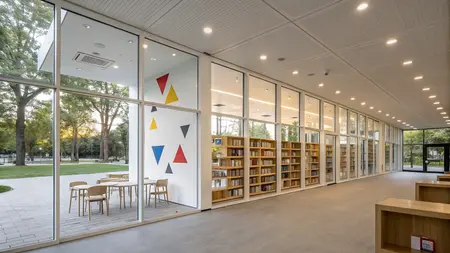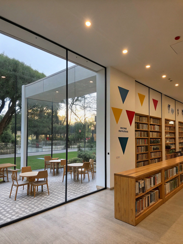 «White bookshop space. One of the walls is made entirely of glass frames through which you can see the park. The perimeter walls have minimalistic graphic red, yellow and blue triangles. Modern wooden furniture, a lot of wooden bookshelves, warm lighting, low ceiling»
