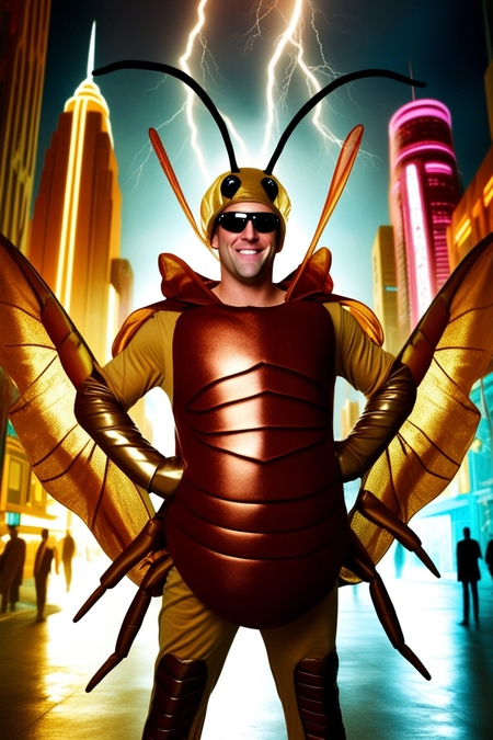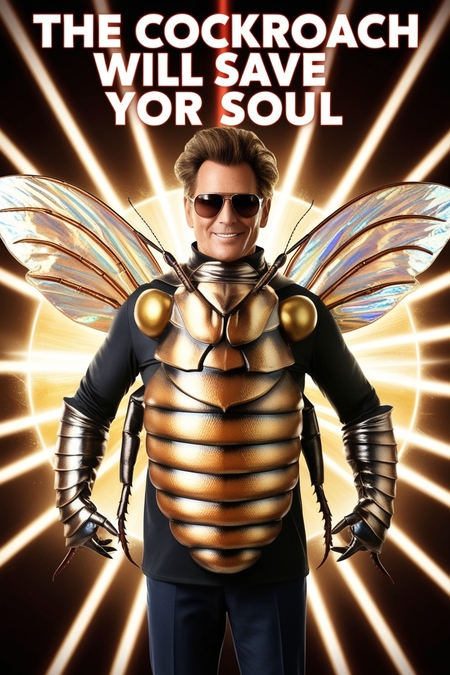 плакат справа: A poster for a fictional cult. In the center smiling man dressed in an oversized, highly detailed cockroach costume with a metallic, armored exoskeleton, glowing golden and bronze hues, and shimmering iridescent wings, wearing stylish sunglasses. Behind him, a radiant. Bold, text at the top «The Cockroach will save yor soul.» The background is dark, illuminated with neon lights.