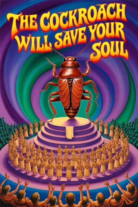 плакат слева: A poster of a fictional cult. In the center there is a huge cockroach to which little people pray. Bold, dramatic text at the top «The Cockroach will save your soul» psychedelic background.
