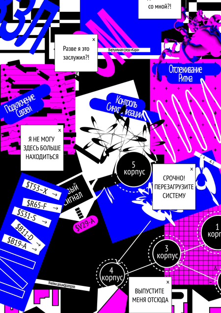 Плакат — хаотичный интерфейс сотрудника Кары, «следящего» за состоянием призраков, находящихся в цифровом пространстве. Нужно выполнять задания и следить за графиками, которые постоянно меняют своё состояние.