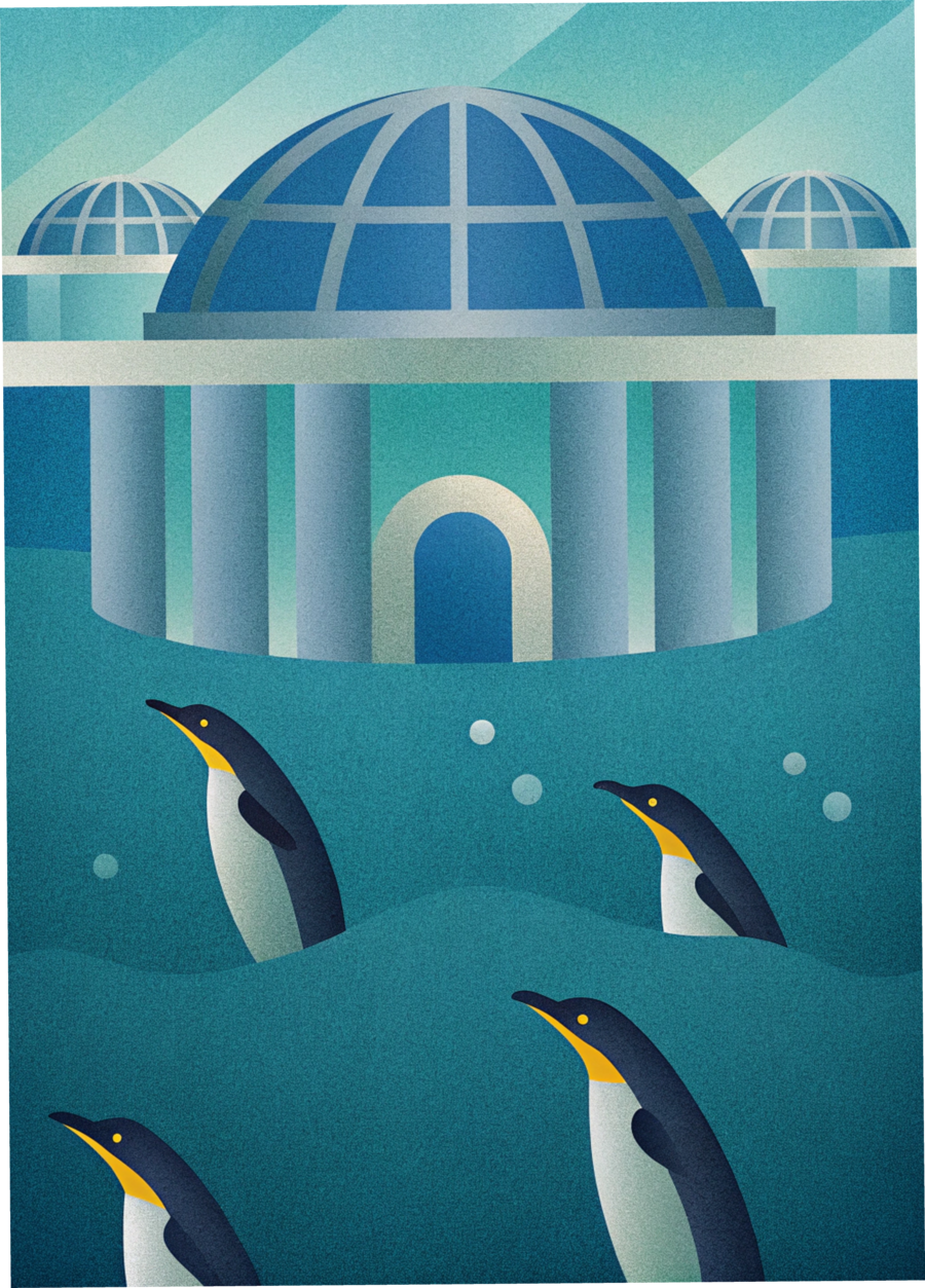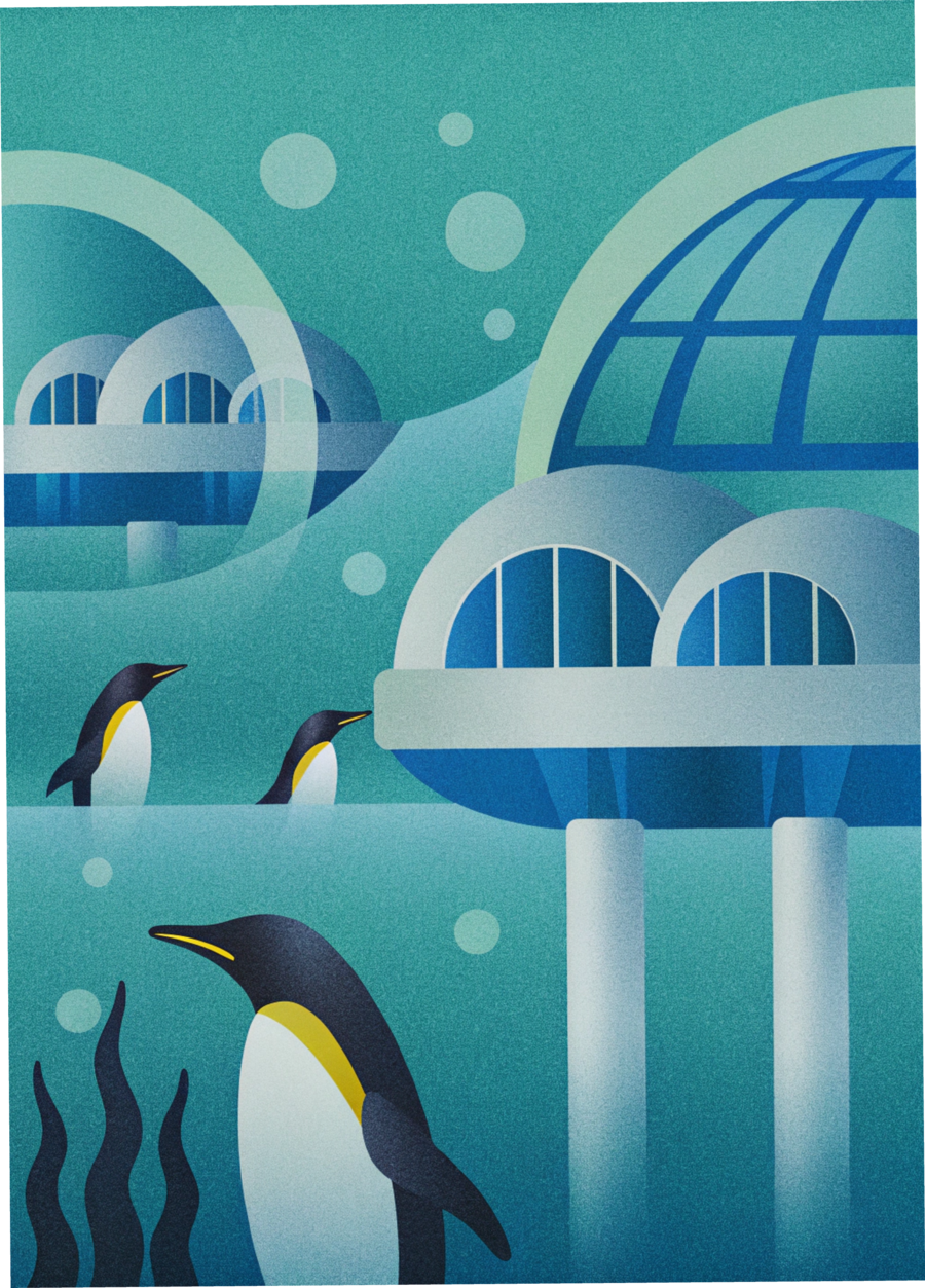 Для создания плакатов использовалась готовая иллюстрация и настройка стиля в recraft.ai и ограниченная цветовая палитра Promt: A stylized poster featuring emperor penguins in a vibrant underwater laboratory. The penguins appear curious and playful, interacting with the lab’s structures. The color palette should be predominantly blues and greens, with pops of orange or yellow from the lab’s lighting.