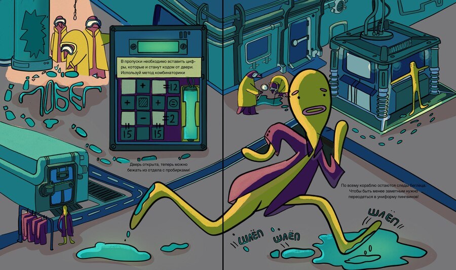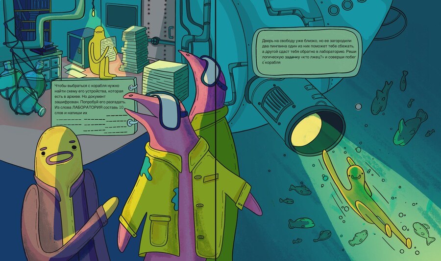 Пингвины-ученые работают в подводной лаборатории и занимаются проведением экспериментов и опытов.