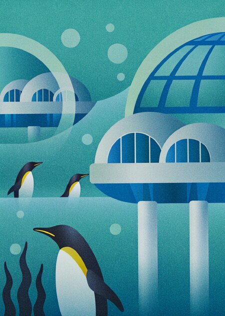 Promt: Create a detailed and realistic illustration of a bustling underwater laboratory inhabited by penguins. The laboratory should be a transparent dome structure, partially submerged in a vibrant ocean environment. Show penguins conducting various scientific experiments, interacting with sophisticated equipment (microscopes, computers, etc.), and generally going about their daily lives within the lab. Include details such as coral reefs, various fish, and other marine life in the surrounding environment. The lighting should be natural and mimic the effects of sunlight penetrating the water.