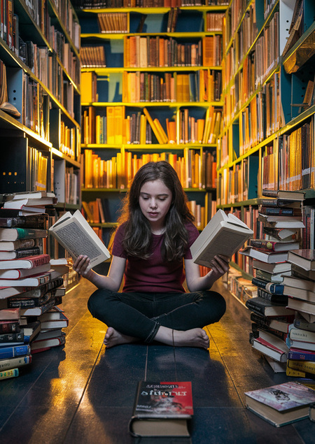 Обложка проекта сгенерирована в нейросети Ideogram от Google: realistic photography. warm yellow and blue light. library. a lot of books. books are everywhere. they are on all the shelves and even on the floor. the girl sits on the floor cross-legged in one hand, one book, in the other hand another. she is reading one of the books in her hands