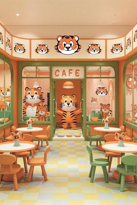 Промпт для второго изображения: A vibrant and energetic photo of a children’s themed cafe featuring cartoony orange tigers. The main attraction is a large, playful tiger mascot with a bright green bowtie, standing next to a menu board. The cafe’s color scheme includes orange, green, yellow, and light blue, giving the space a cheerful and inviting atmosphere. The poster is prominently displayed in a mall setting, attracting the attention of passersby., photo