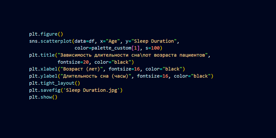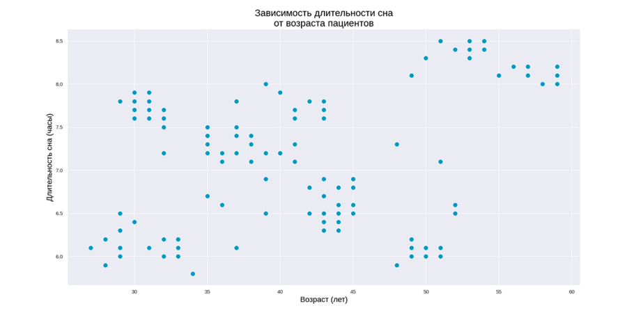 Точечная диаграмма визуализирует зависимость длительности сна от возраста пациентов. С помощью нее можно определить общие тенденции, например, имеется ли связь между возрастом и длительностью сна (например, с возрастом люди спят больше, меньше или изменений нет). Если точки разбросаны хаотично, это может означать отсутствие связи между двумя переменными.