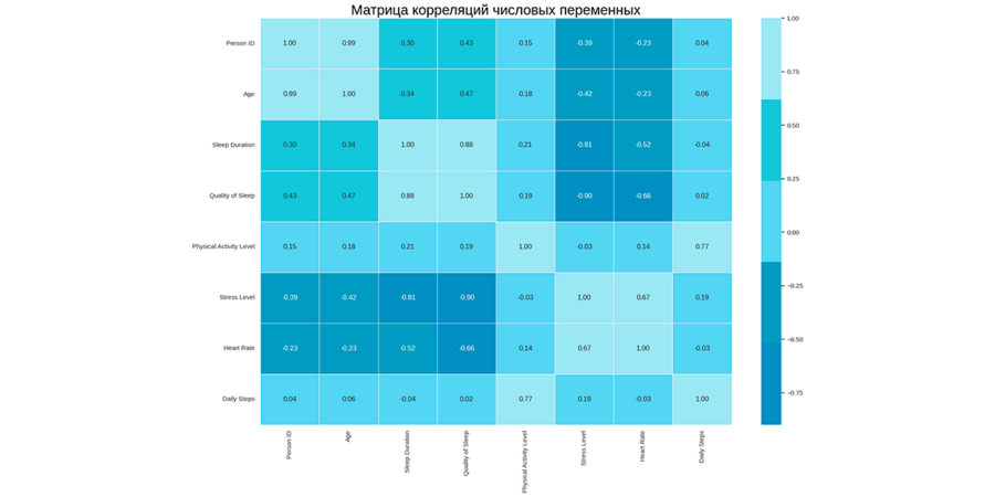 Анализ взаимосвязей позволяет выявить пары переменных, которые сильно коррелируют (например, «Age» и «Sleep Duration»), что может указывать на сильную зависимость. Если корреляция отрицательная, это указывает на обратную зависимость (например, чем больше одно значение, тем меньше другое). В то время как положительные значения означают прямую зависимость (например, увеличение одной переменной связано с увеличением другой).
