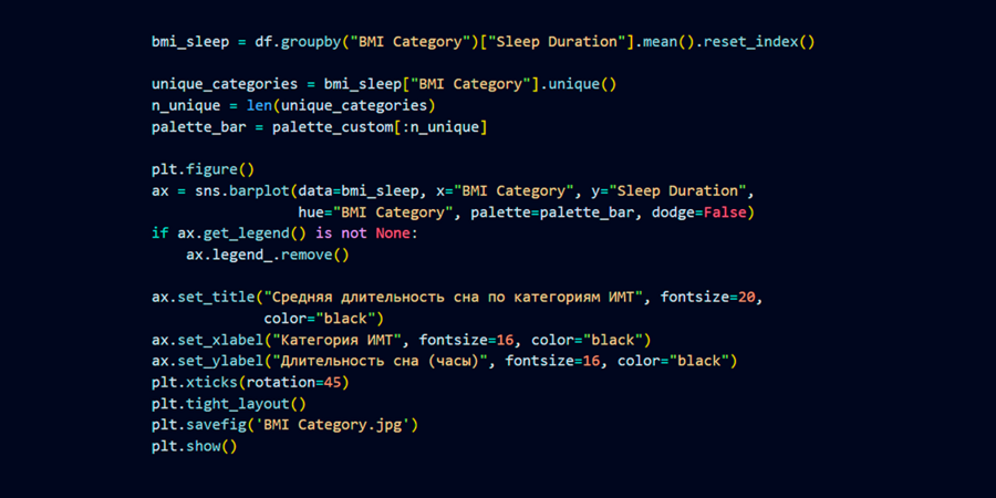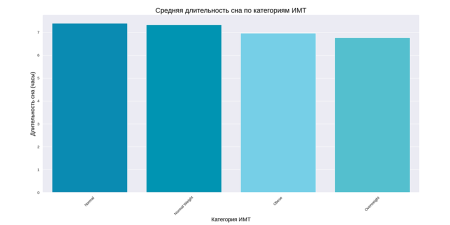 Этот график помогает понять, как индекс массы тела влияет на продолжительность сна. Например, можно выявить, спят ли люди с нормальным ИМТ дольше, чем люди с избыточным весом или ожирением.