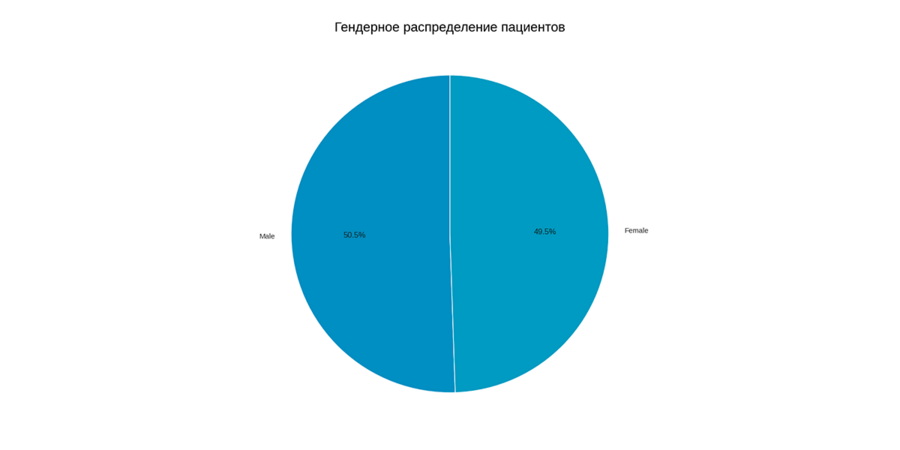 Эта круговая диаграмма отображает гендерное распределение пациентов из датасета. Диаграмма иллюстрирует, какая часть выборки состоит из мужчин и женщин. Можно заметить, что количество пациентов обоих полов примерно одинаковое.