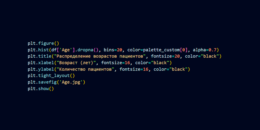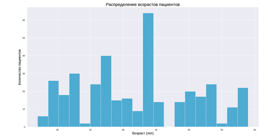 Для визуализации данных я выбрала несколько типов графиков: Распределение возрастов пациентов (гистограмма): Позволяет понять, какие возрастные группы представлены в выборке и насколько равномерно они распределены.