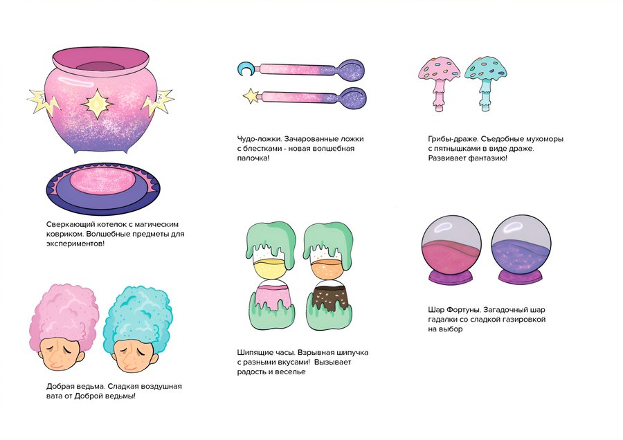 Create a whimsical and magical product catalog featuring the following items: 1. A sparkling pink cauldron with glittery details and magical symbols on its surface, paired with a matching shiny mat. 2. Glittery enchanted spoons in pink and purple hues, with star and crescent moon shapes at the handles’ ends. 3. Edible pastel-colored mushrooms resembling fly agaric with candy spots, inspiring imagination. 4. Playful cotton candy characters, one pink and one blue, with smiling witch-like faces beneath fluffy candy hair. 5. Colorful layered fizzy candies shaped like hourglasses, covered in melting glaze. 6. Fortune-telling crystal balls filled with sparkling soda in pink and purple tones. 7. Chewy candy mice with glittery surfaces, available in grape and strawberry flavors. 8. Licorice candy frogs in green tones, offered in strawberry and banana flavors. 9. Gingerbread Voodoo dolls, decorated with tiny hearts, in mint and orange flavors. 10. Grape and milk-flavored stick cookies in whimsical packaging. 11. Magical quartz crystal candies with jelly and gummy interiors. 12. Colorful gummy worms presented in elegant glass jars.