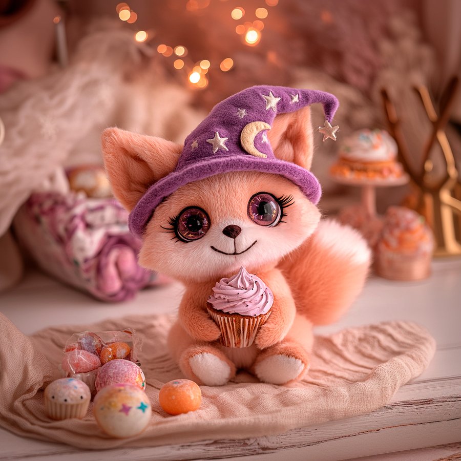 (1): A plush fox with soft pink fur, big expressive eyes and a playful grin. The fox is wearing a purple witch’s hat decorated with small stars and a moon. In her hands she holds a plush cupcake with swirly frosting. In the background are candy, a soft bed — Zoom Out