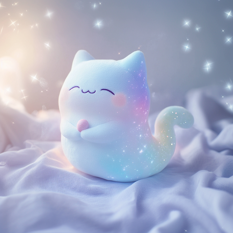 (2): A ghostly cat plush toy. The toy has a flowing, ethereal body resembling a classic ghost, with visible cat ears, a cute face, and no distinct paws except for a suggestion of front limbs holding a small candy. Its face features a playful expression with closed eyes, a pink nose, and an open mouth. The design includes a pastel blue and white palette, with colorful sparkles scattered across the ghostly body, giving it a magical and whimsical feel. The background is soft and light, with subtle sparkles and glowing elements to enhance the enchanting atmosphere. — Zoom Out