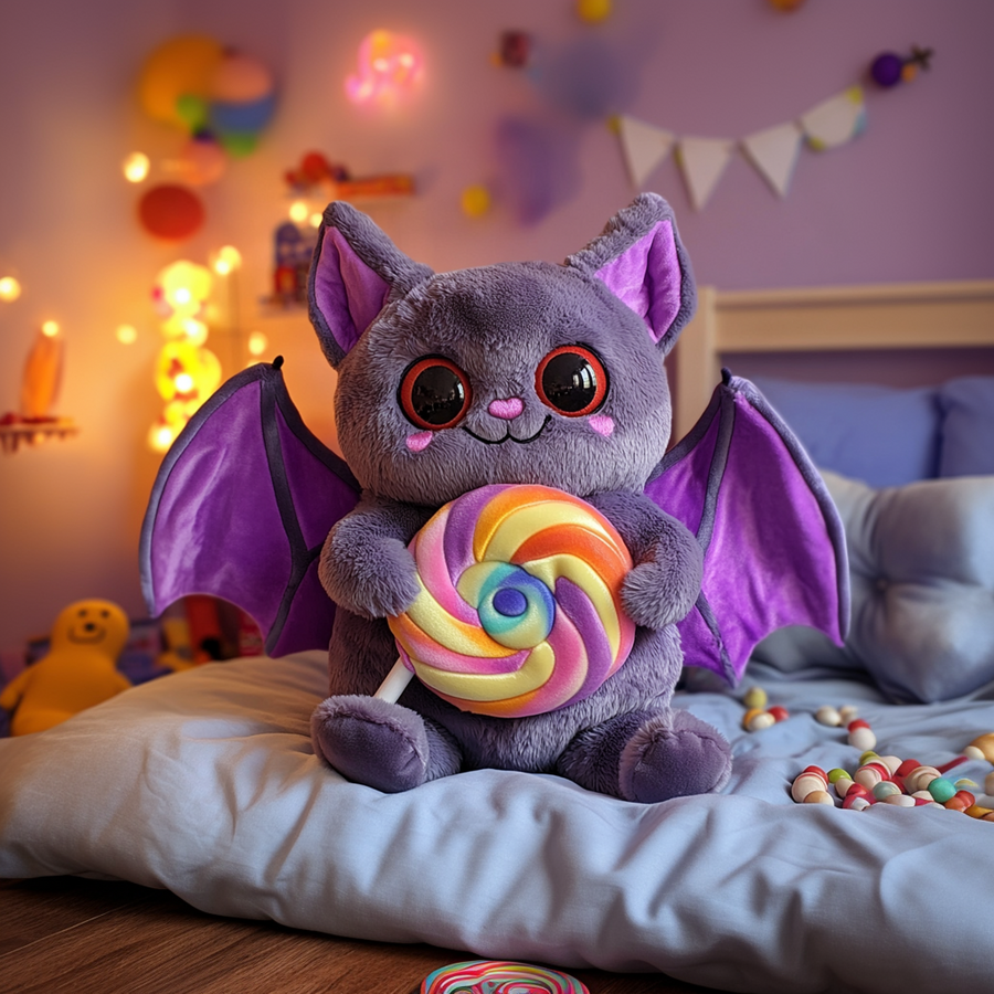 (3): A round plush bat with velvety purple fur, wide wings and a cheerful expression. In his hands, the bat holds a plush lollipop with bright, swirly colors. In the background, there is candy and a soft bed — Zoom Out